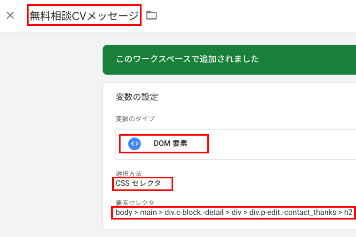 このメッセージが表示されるHTML要素をGTMで検知し、CVタグを発火させるのがこの方法です。