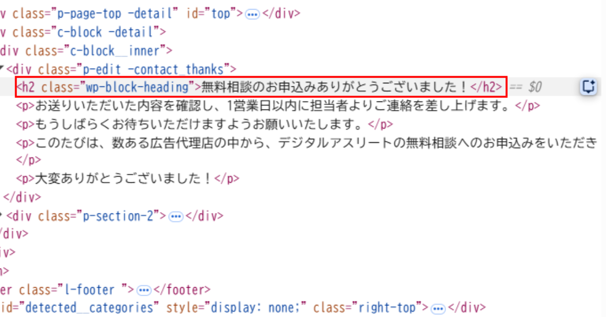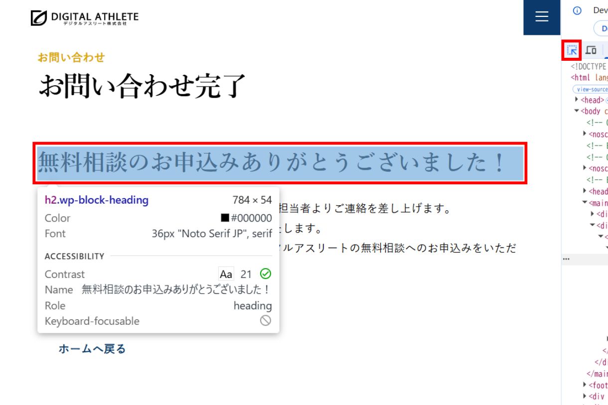 デベロッパーツール(右クリック→「検証」またはF12キー)を開き、右上の矢印ボタン→サンクスメッセージ部分にカーソルを合わせます。