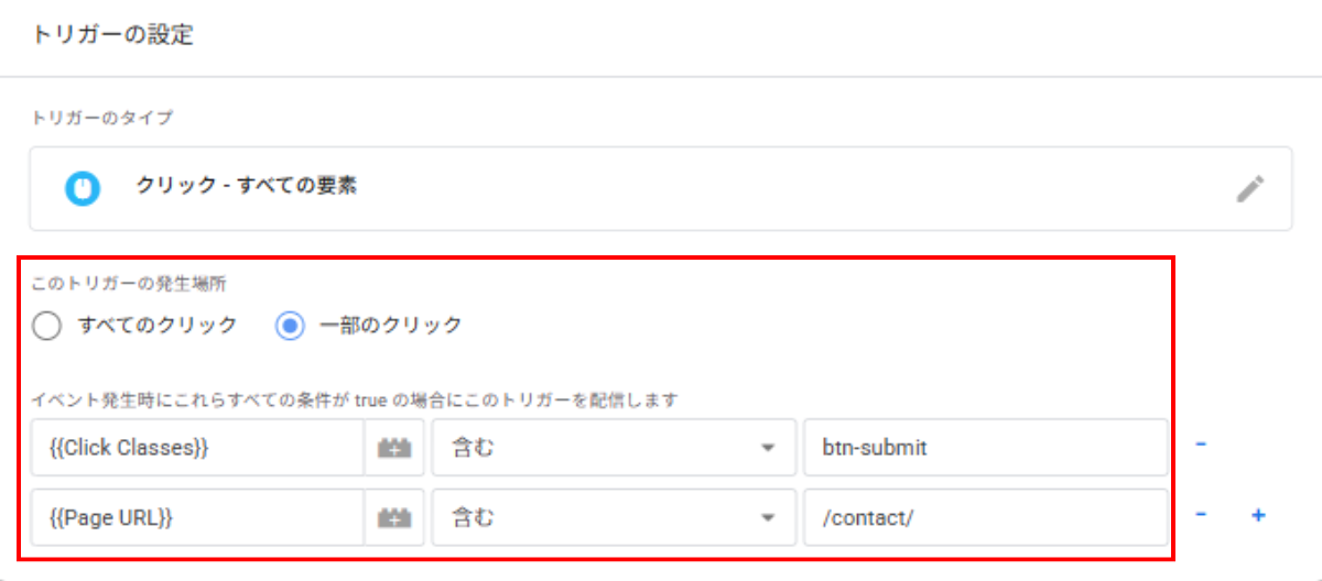 「このトリガーの発生場所」で「一部のクリック」を選択し、以下のように条件を2つ追加します。