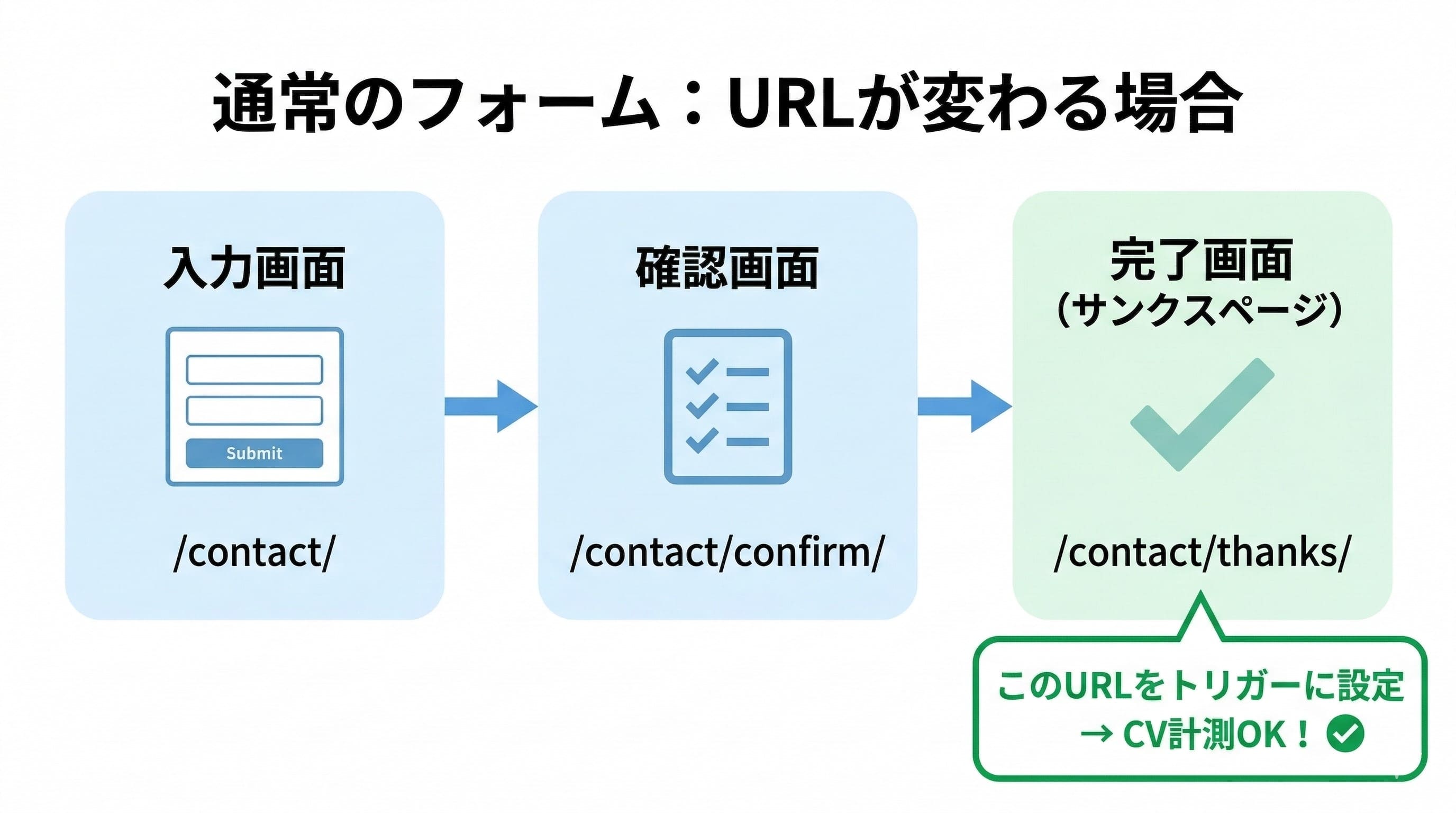 この記事では、「フォーム入力後もページURLが変わらない場合にCVを計測する方法」について画像付きで解説します。