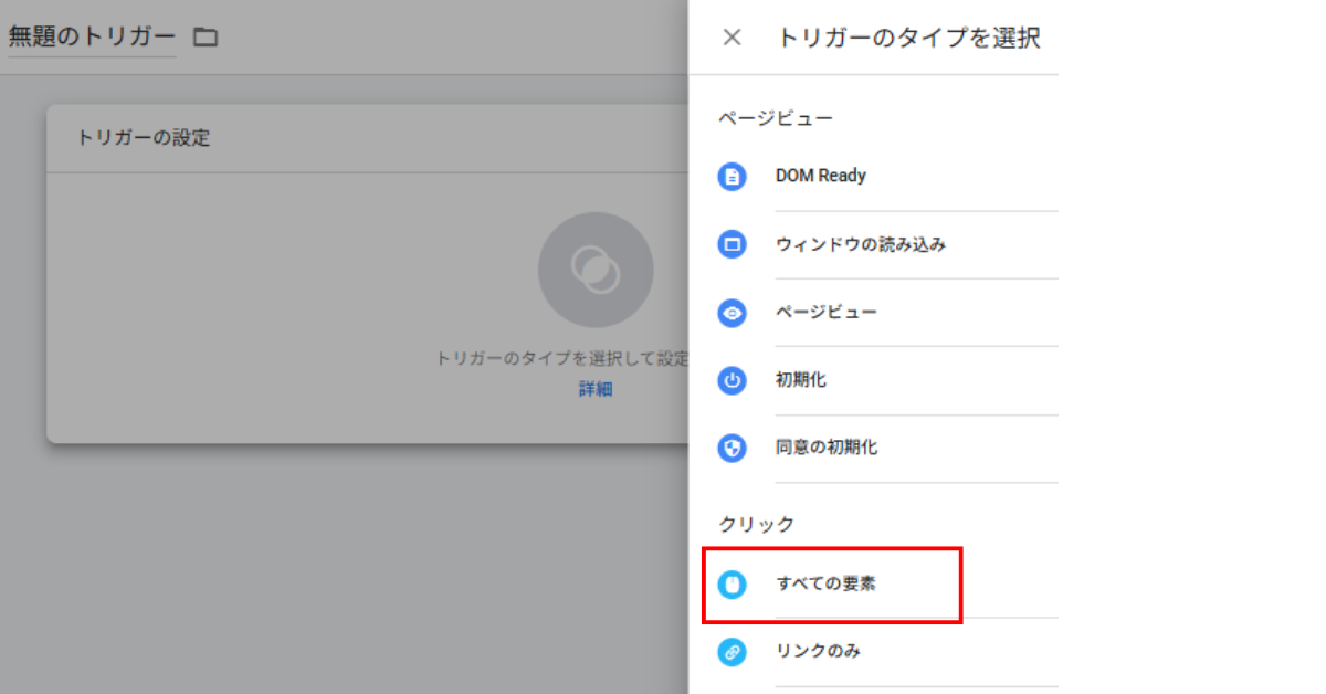 「トリガーの設定」のクリックカテゴリの中から「すべての要素」を選択します。
