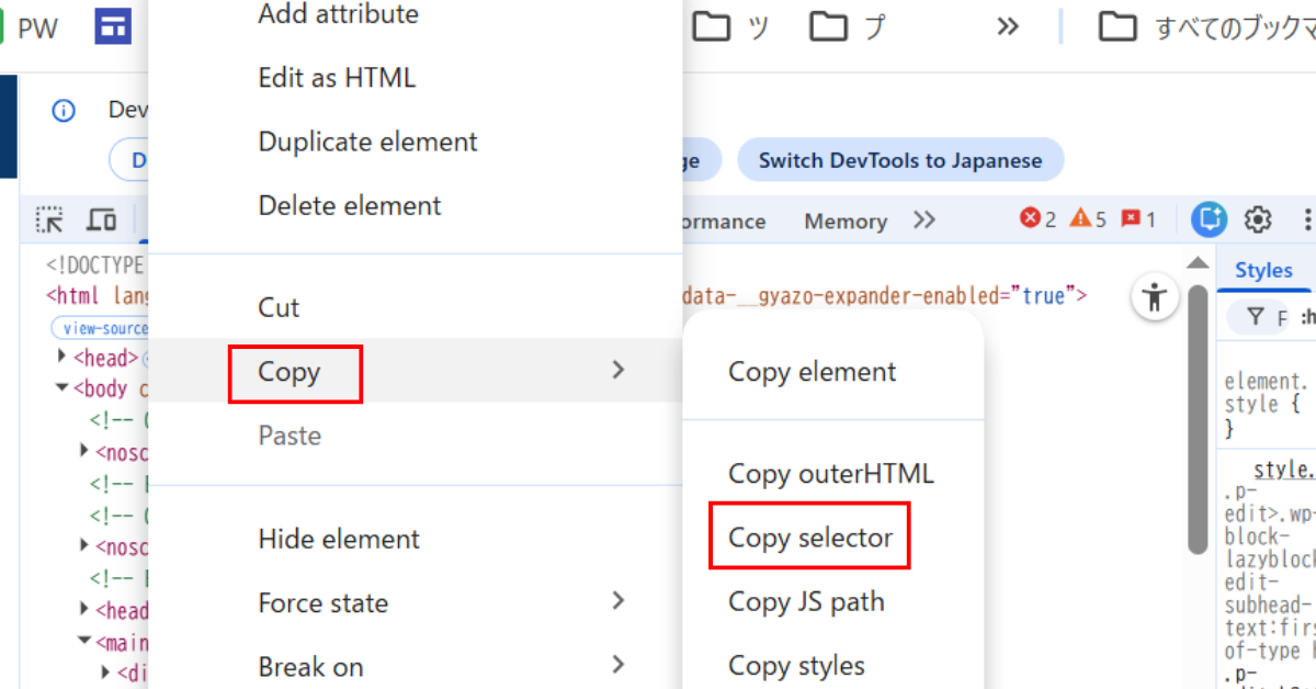 ここで右クリック→Copy→Copy selectorを選択し、セレクタを保存しておきます。※セレクタ(selector)は、主にCSSやJavaScriptで使われる概念で、HTML文書の中から特定の要素を「選択」するための記法です。