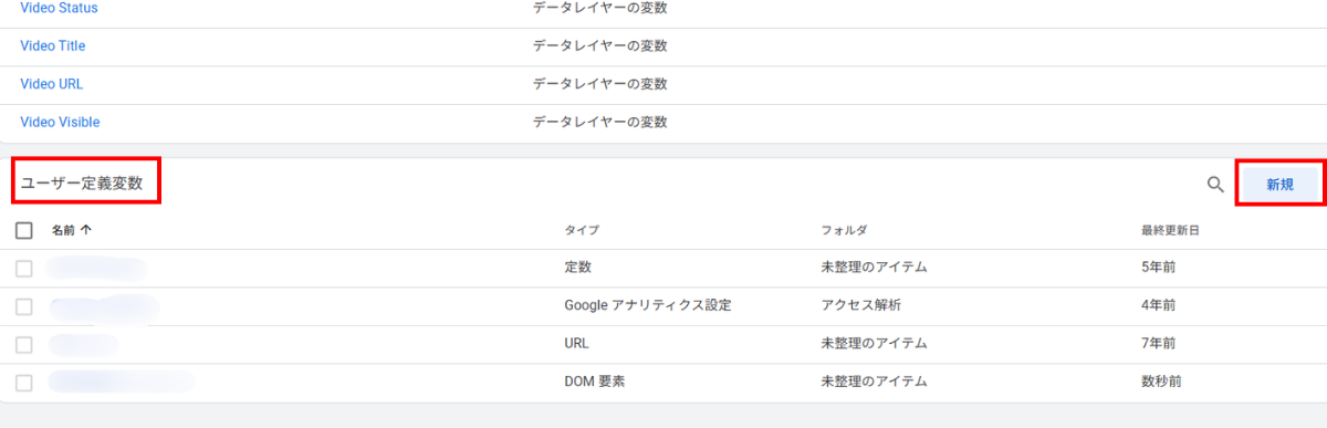 GTMの管理画面を開き、左メニューの「変数」から「ユーザー定義変数」の「新規」をクリックします。