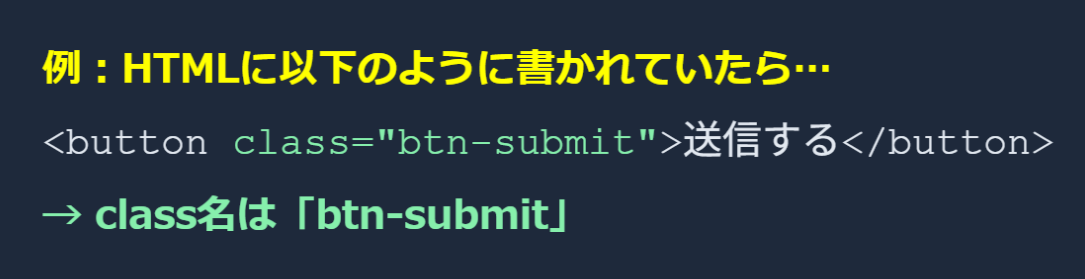 もし、class名が複数ある場合「class=”btn btn-submit btn-lg”」 のように、スペース区切りで複数ある場合は、最もユニーク(他のボタンと被らない)そうなものを使います。
