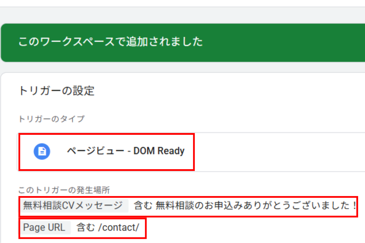 DOM Readyトリガーはページ読み込み時に1回だけ評価されるため、ページ遷移を伴わずにJavaScriptでサンクスメッセージが後から描画されるタイプのフォームでは、DOM Ready時点ではまだ要素が存在しない可能性があります。
