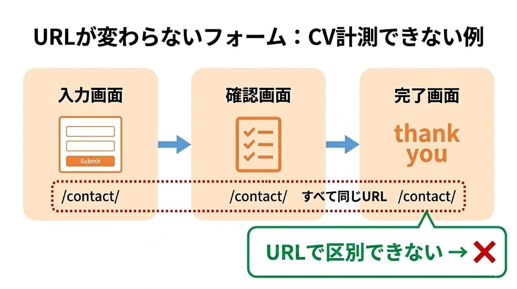 広告運用やサイト運用をする際、計測したCVポイントはあるのに、フォーム送信後のURLが変わらないことでページビューによるCV計測ができないことがありませんか?