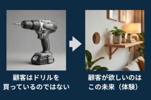 これは、マーケティングでよく語られる「ドリルと穴」の話と同じです。 顧客は「ドリル(道具)」が欲しいのではなく、「穴(体験・結果)」が欲しいのです。